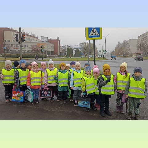 Практическое занятие-поход "К светофору в жилетках". Группа детей в специальных детских световозвращающих жилетах совершила выход к ближайшему переходу со светофором. На месте были отработаны и закреплены правила перехода проезжей части.
