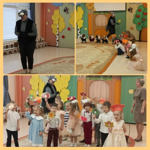 Яркий и запоминающийся праздник Осени прошёл 28 октября в нашей группе! Под звуки осенней музыки дети торжественно вошли в зал, и рпаздник начался с традиционного исполнения песни "Осень", которая помогла всем почувствовать красоту этого золотого времени года. После песни ребята пригласили Осень в большой и дружный хоровод, закружившись в весёлом танце под аплодисменты гостей. Юные таланты с большим удовольствием читали стихи об осени, её дарах и ярких красках. Особый восторг у зрителей вызвали театрализованные инсценировки. Первая история рассказала о Кошечке, Собачке и осеннем Дождике. Во второй сценке на полянку вышли лесные жители: трусливый Зайка, хитрая Лисичка, трудолюбивая Белочка и добрый Мишка. Они веселились и рассказывали о своих осенних запасах. Но внезапно праздник был нарушен! С хулиганскими намерениями ворвался Волк. Он навёл беспорядок, разбросал все запасы и напугал зверят.