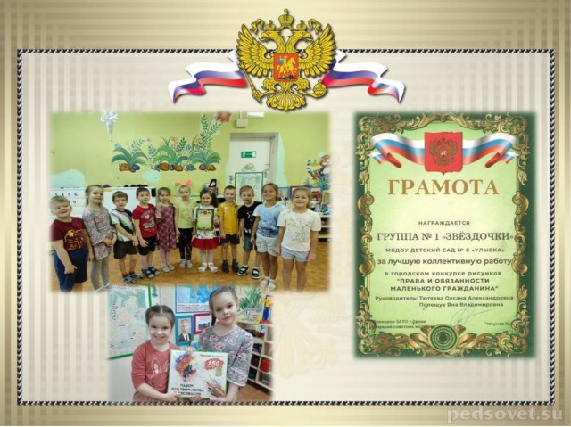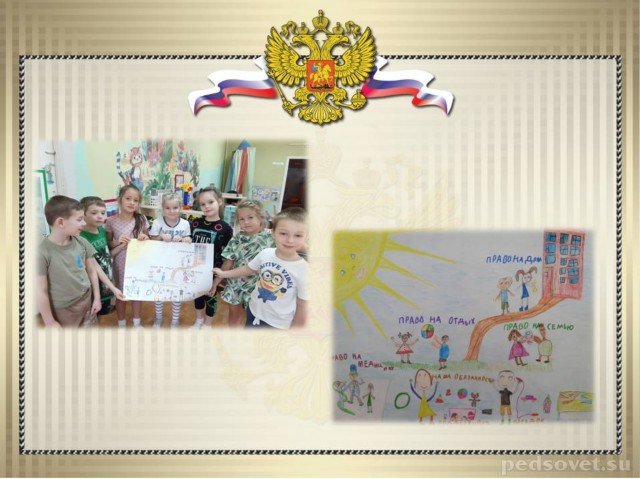 Дети – будущее нашего государства. Дошкольное детство – это не просто уникальный период в жизни человека в процессе, которого формируется характер, укрепляются чувства собственного достоинства и уверенности, это еще и период, когда ребенок находится в полной зависимости его взрослых родителей, педагогов. Здоровье детей и их полноценное развитие во многом определяется эффективностью работы по защите их прав. Многим взрослым трудно понять и принять, что ребенок – равноправный с ними человек, имеющий право на собственные поступки и мнение. Его право, как и право любого человека, нужно уважать и не нарушать. Дети с интересом участвовали в непосредственной деятельности, беседах, в художественном творчестве, ролевых играх, в ходе которых они знакомились с основными правами и обязанностями – правом на жизнь и имя, образование и отдых, медицинскую помощь и правильное питание, на любовь и заботу со стороны взрослых. Все полученные знания, дети смогли отразить в коллективном рисунке, который был отправлен на городской конкурс рисунков "Права и обязанности маленького гражданина", приуроченного к 300-летию Прокуратуры РФ и Всероссийскому дню правовой помощи детям. Наша группа удостоена специальной номинации "Лучшая коллективная работа"!!!