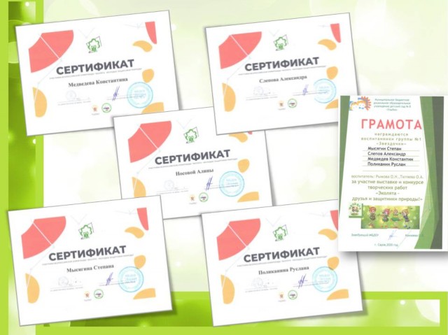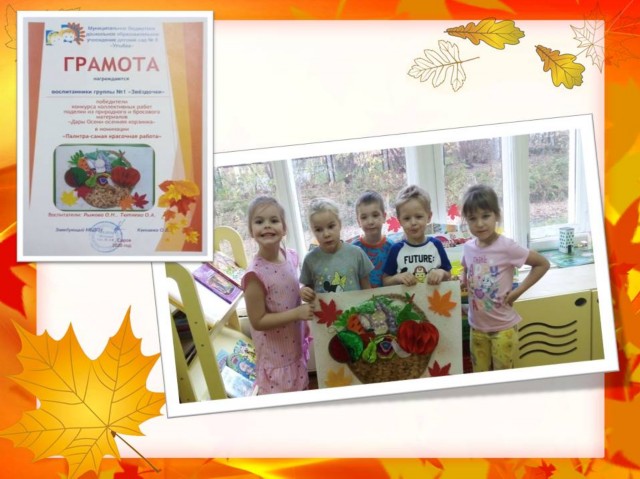 В нашем детском саду стало доброй традицией, каждую осень проводить выставку-конкурс поделок из природного материала и этот год не стал исключением. Был объявлен творческий конкурс коллективных работ "Дары Осени – осенняя корзинка". Создавать осенние работы вместе с детьми – одно удовольствие и очень полезное занятие, которое развивает не только творческое мышление, воображение, мелкую моторику, но и способность концентрировать внимание. Вот такая красота у нас получилась в совместном творчестве дети + родители + педагоги. Заслуженная грамота в номинации "Палитра – самая красочная работа".