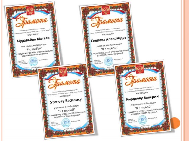 3 декабря во всем мире отмечается Международный день инвалидов. К этой дате приурочены различные мероприятия для людей с ограниченными возможностями, направленные на привлечение внимания общества к трудностям и надеждам этих людей. В нашем городе ГБУ "Центр социальной помощи семье и детям города Сарова" была организована онлайн-акция "Я с тобой" в поддержку детей с ограниченными возможностями здоровья. Мы с детьми с удовольствием приняли участие в этой акции. Все участники были награждены грамотами.