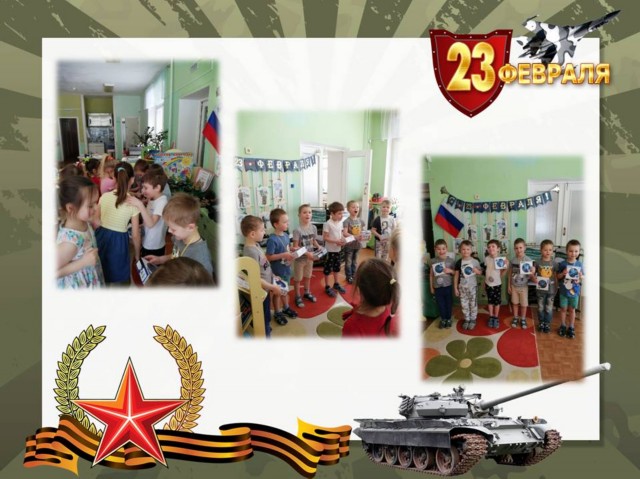 23 февраля – это замечательный праздник настоящих мужчин – и это не только те, кто служил. Настоящий мужчина – это тот, кто выполняет свои обещания, защищает и помогает тем, кто слабее. Не важно, в каком возрасте мужчина, главное, что он – МУЖЧИНА! В преддверии праздника в нашем детском саду прошёл музыкально-спортивный праздник, посвящённый Дню защитника Отечества. Спортивные соревнования – это всегда праздник, а любой праздник должен выглядеть запоминающимся и увлекательным. Наш спортивный праздник удался! В совместном творчестве детей и взрослых были изготовлены подарки для пап, необычная поделка "Военный танк", а мальчикам были вручены приятные сюрпризы от девочек. От всего нашего коллектива поздравляем всех настоящих мужчин с этим замечательным праздником. Хотелось бы пожелать здоровья и счастья. Будьте нужными и любимыми, сильными и смелыми!